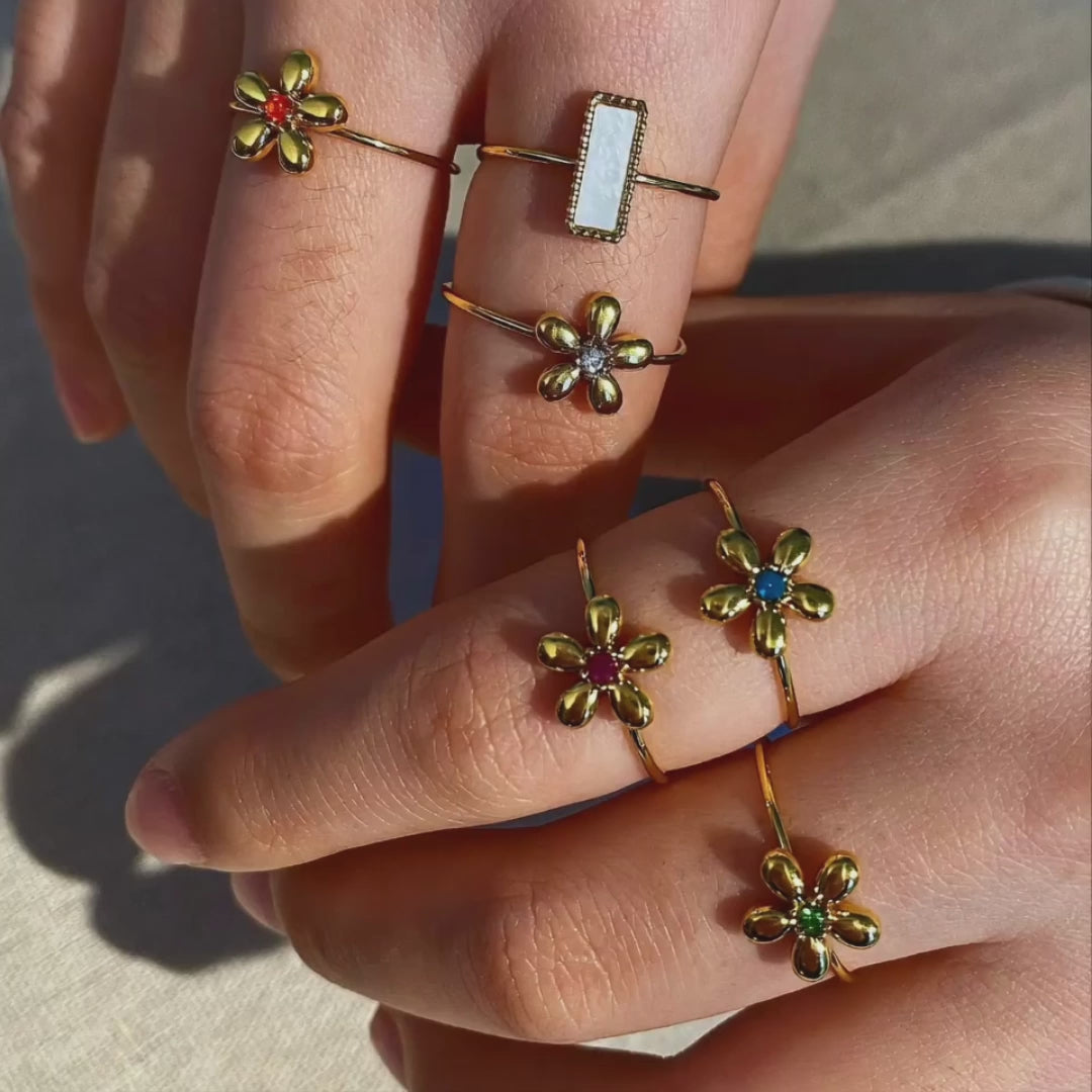 A delicate floral ring accented with a subtle central zircon, blending softness and elegance in a refined, feminine silhouette. A charming piece that adds a gentle sparkle to everyday looks.